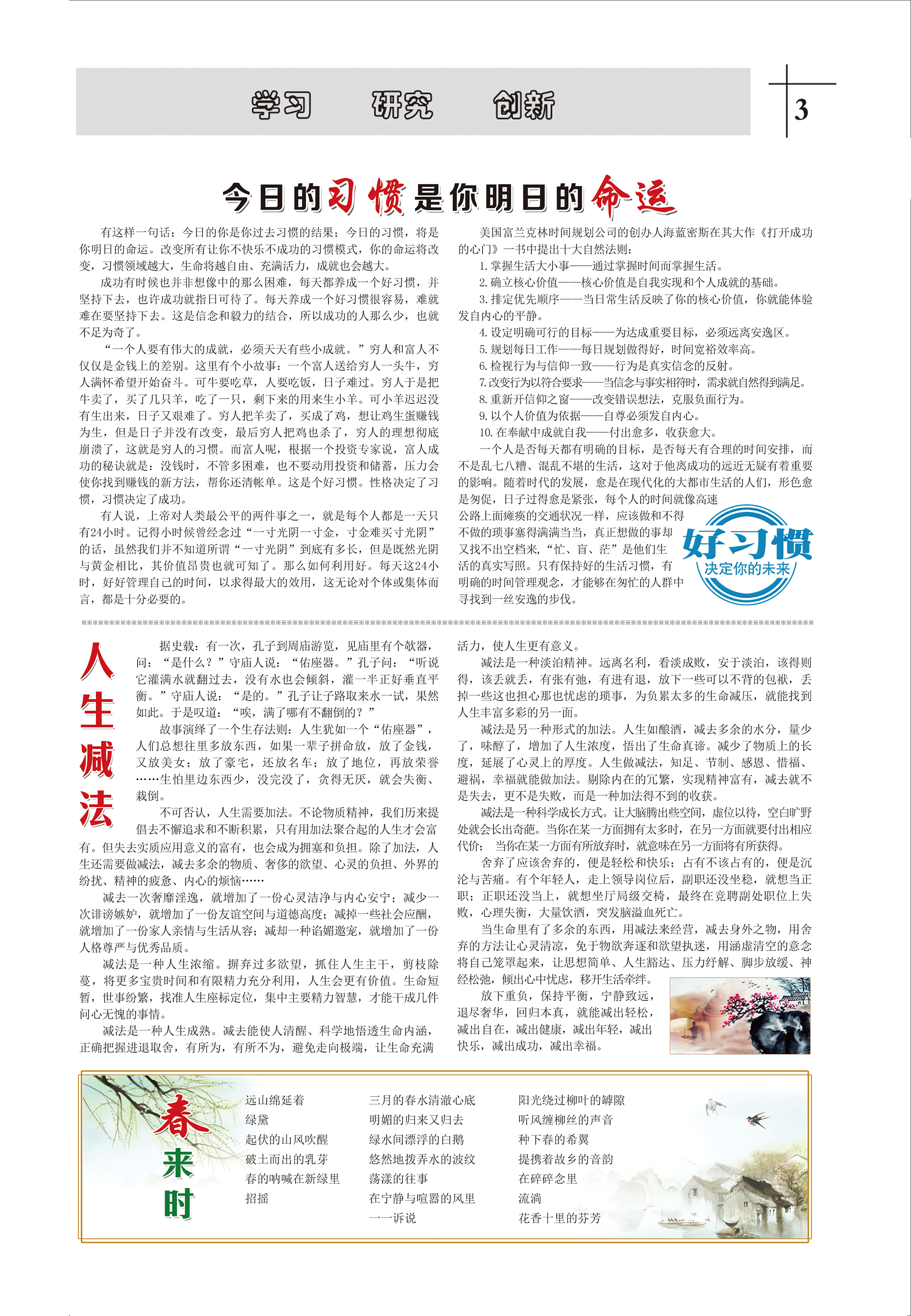 有這樣一句話:今日的你是你過去習(xí)慣的結(jié)果;今日的習(xí)慣,將是你明日的命運。改變所有讓你不快樂不成功的習(xí)慣模式,你的命運將改變,習(xí)慣領(lǐng)域越大,生命將越自由、充滿活力,成就也會越大。
