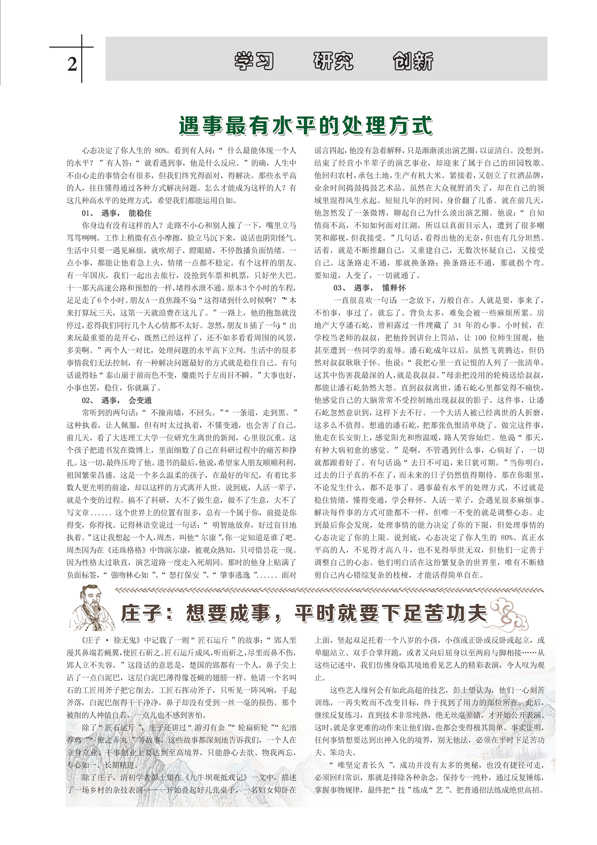 心態(tài)決定了你人生的80%??吹接腥藛枺骸笆裁醋钅荏w現(xiàn)一個(gè)人的水平?”有人答:“就看遇到事,他是什么反應(yīng)?!钡拇_,人生中不由心走的事情會(huì)有很多,但我們終究得面對(duì),得解決