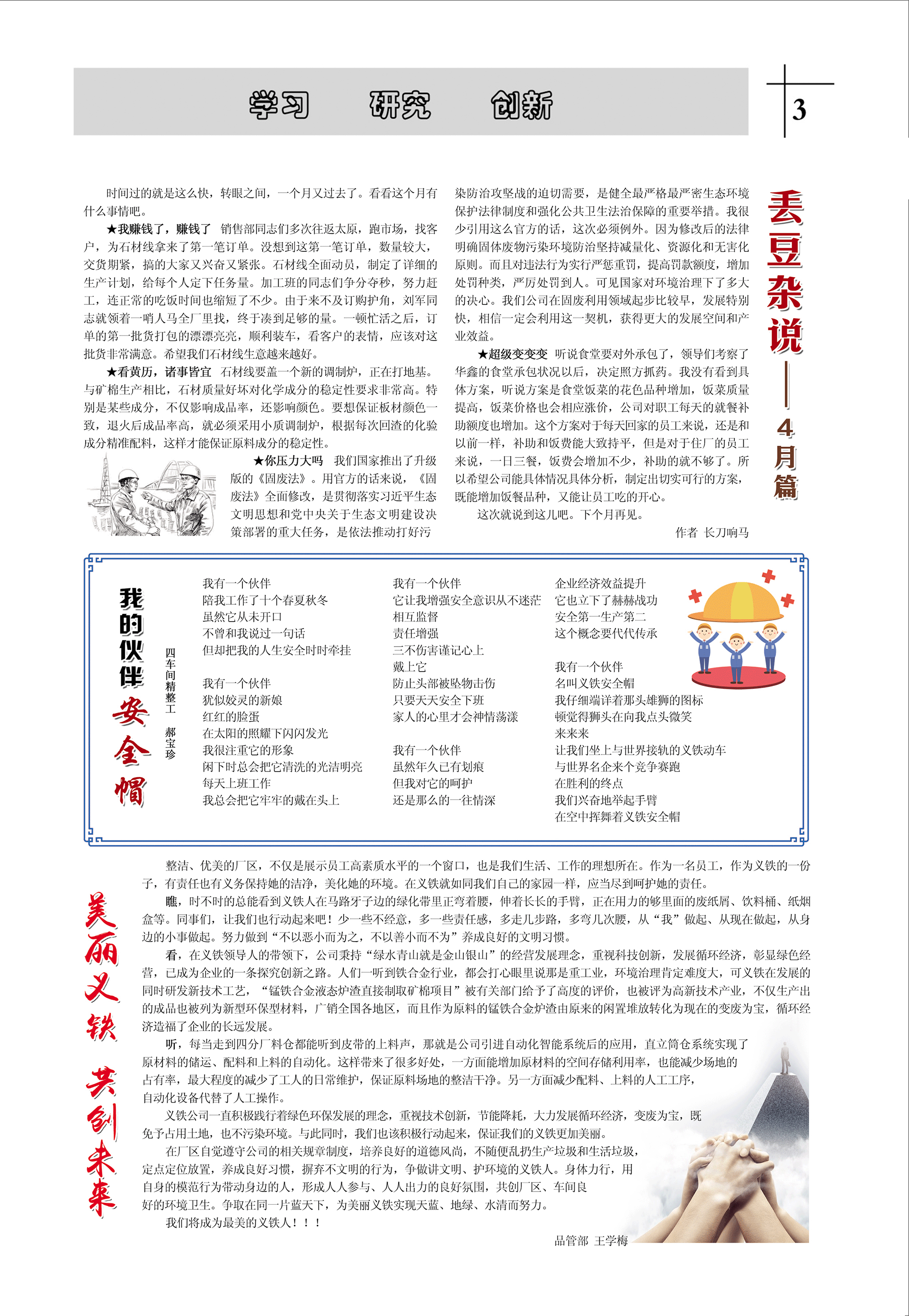 整潔、優(yōu)美的廠區(qū),不僅是展示員工高素質(zhì)水平的一個(gè)窗口,也是我們生活、工作的理想所在。作為一名員工,作為義鐵的一份子,有責(zé)任也有義務(wù)保持她的潔凈,美化她的環(huán)境。在義鐵就如同我們自己的家園一樣,應(yīng)當(dāng)盡到呵護(hù)她的責(zé)任。