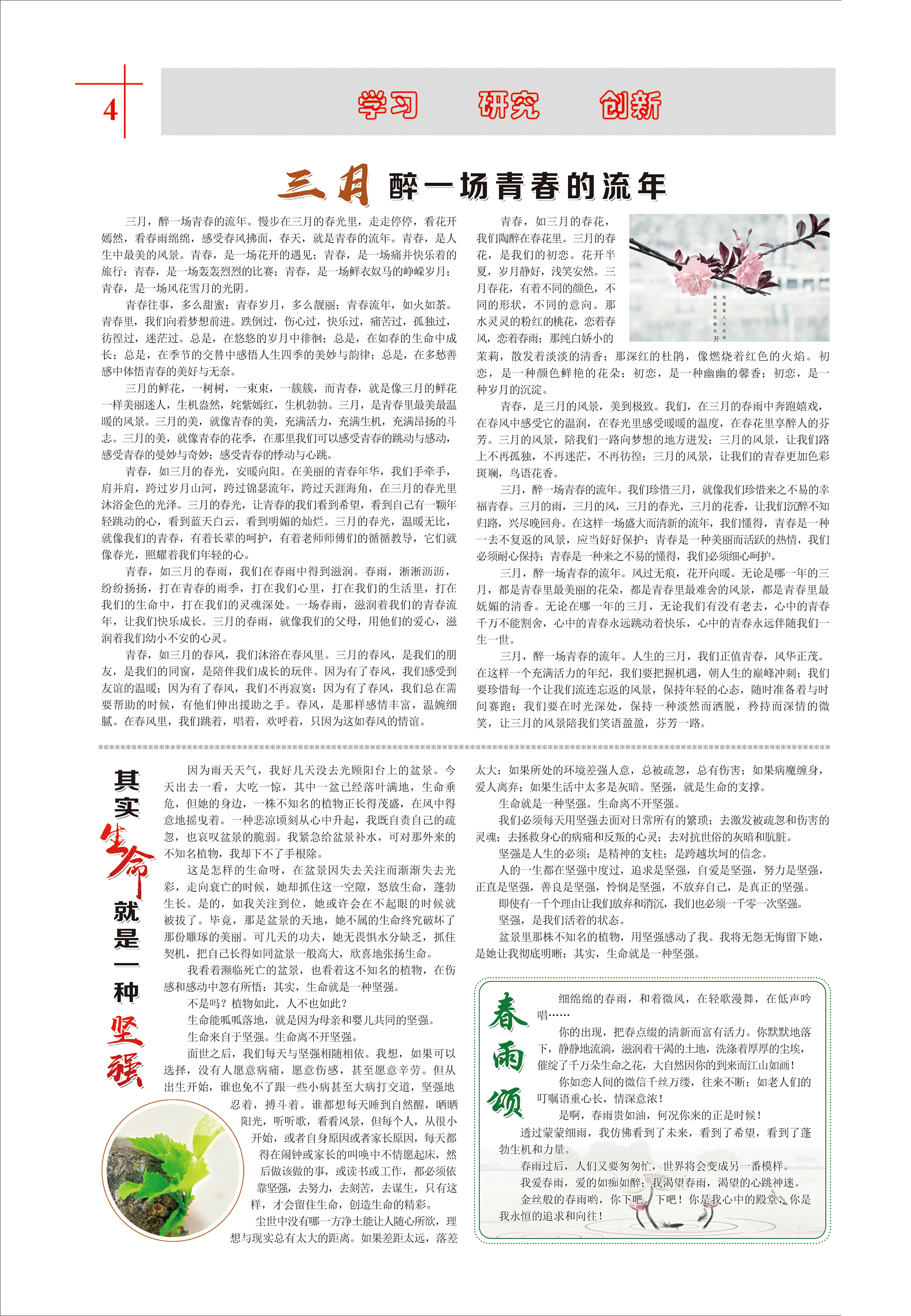 三月,醉一場青春的流年。慢步在三月的春光里,走走停停,看花開嫣然,看春雨綿綿,感受春風(fēng)拂面,春天,就是青春的流年。
