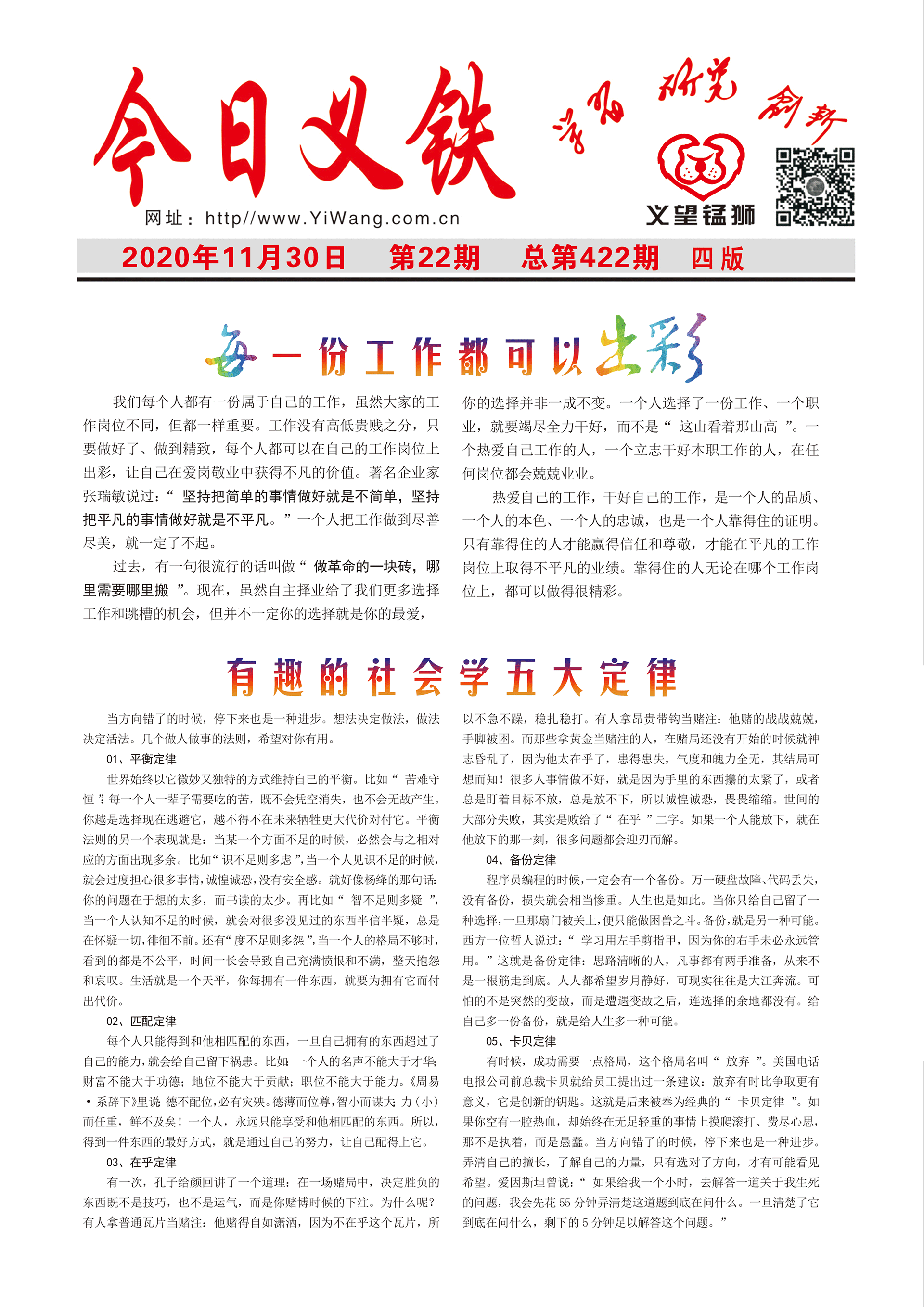 我們每個人都有一份屬于自己的工作,雖然大家的工作崗位不同,但都一樣重要。工作沒有高低貴賤之分,只要做好了、做到精致,每個人都可以在自己的工作崗位上出彩,讓自己在愛崗敬業(yè)中獲得不凡的價值。