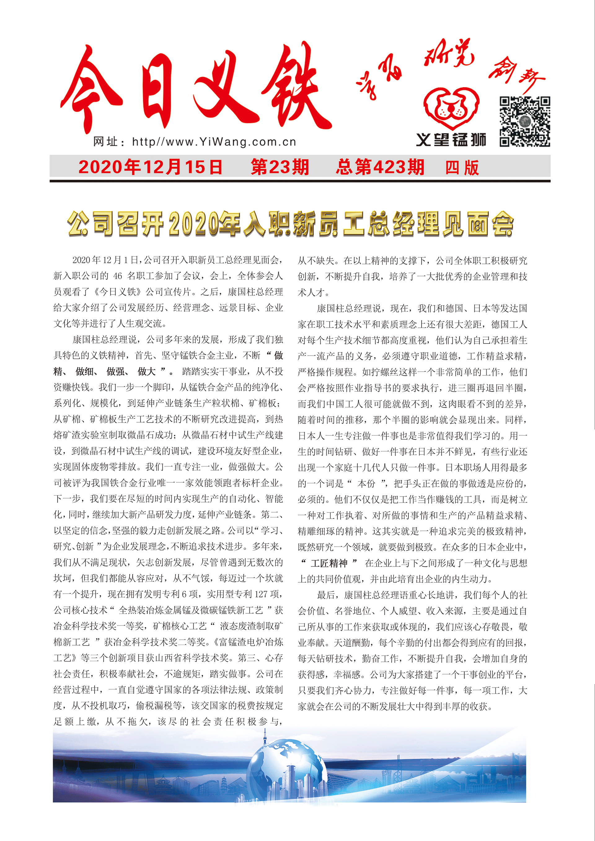 2020年12月1日,公司召開入職新員工總經(jīng)理見面會(huì),新入職公司的46名職工參加了會(huì)議,會(huì)上,全體參會(huì)人員觀看了《今日義鐵》公司宣傳片。之后,康國柱總經(jīng)理給大家介紹了公司發(fā)展經(jīng)歷、經(jīng)營理念、遠(yuǎn)景目標(biāo)、企業(yè)文化等并進(jìn)行了人生觀交流。