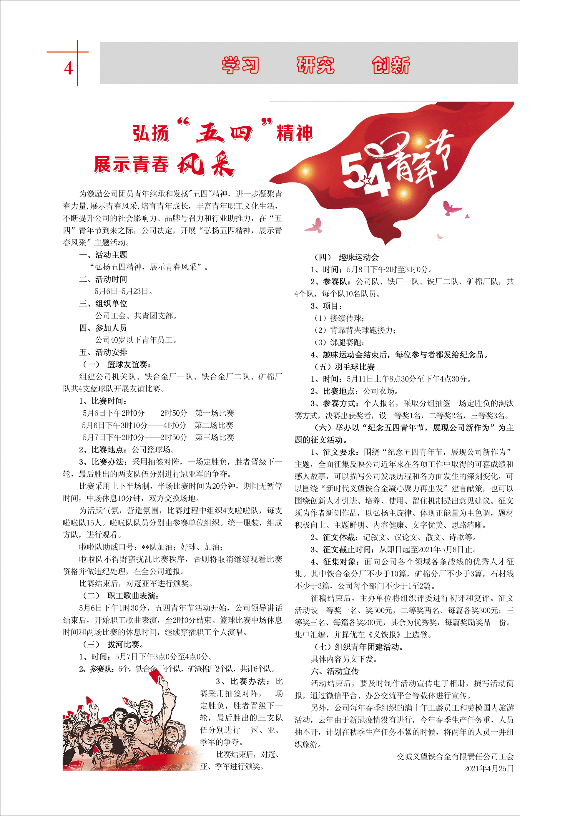 為激勵公司團(tuán)員青年繼承和發(fā)揚(yáng)"五四"精神,進(jìn)一步凝聚青春力量,展示青春風(fēng)采,培育青年成長,豐富青年職工文化生活,不斷提升公司的社會影響力、品牌號召力和行業(yè)助推力,在“五四”青年節(jié)到來之際,公司決定,開展“弘揚(yáng)五四精神,展示青春風(fēng)采”主題活動。