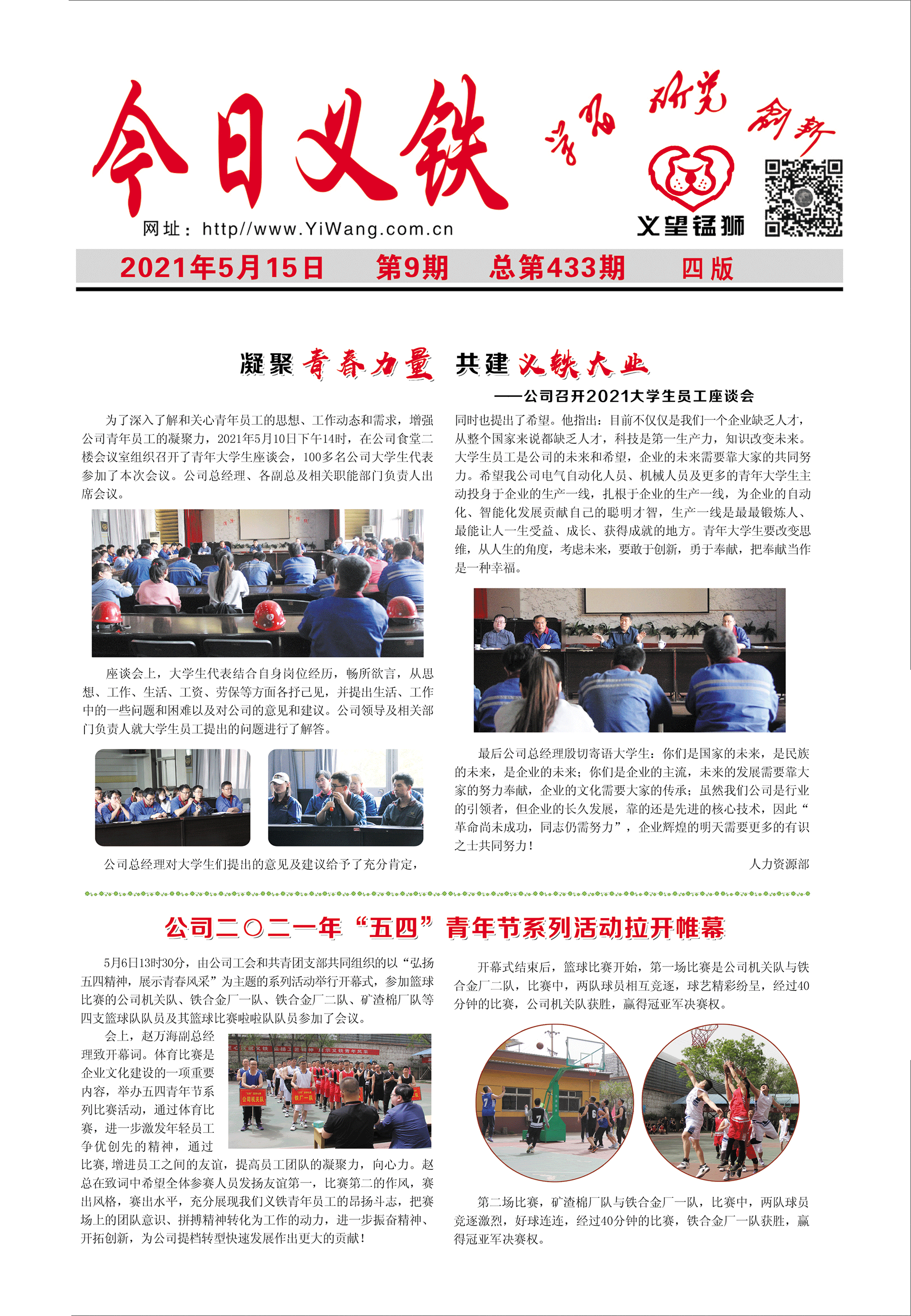 5月6日13時30分,由公司工會和共青團支部共同組織的以“弘揚五四精神,展示青春風采”為主題的系列活動舉行開幕式,參加籃球比賽的公司機關(guān)隊、鐵合金廠一隊、鐵合金廠二隊、礦渣棉廠隊等四支籃球隊隊員及其籃球比賽啦啦隊隊員參加了會議。